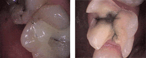 The tooth on the left has the old, large style of filling. Once that filling is removed, notice how cracked and damaged the tooth is underneath.
